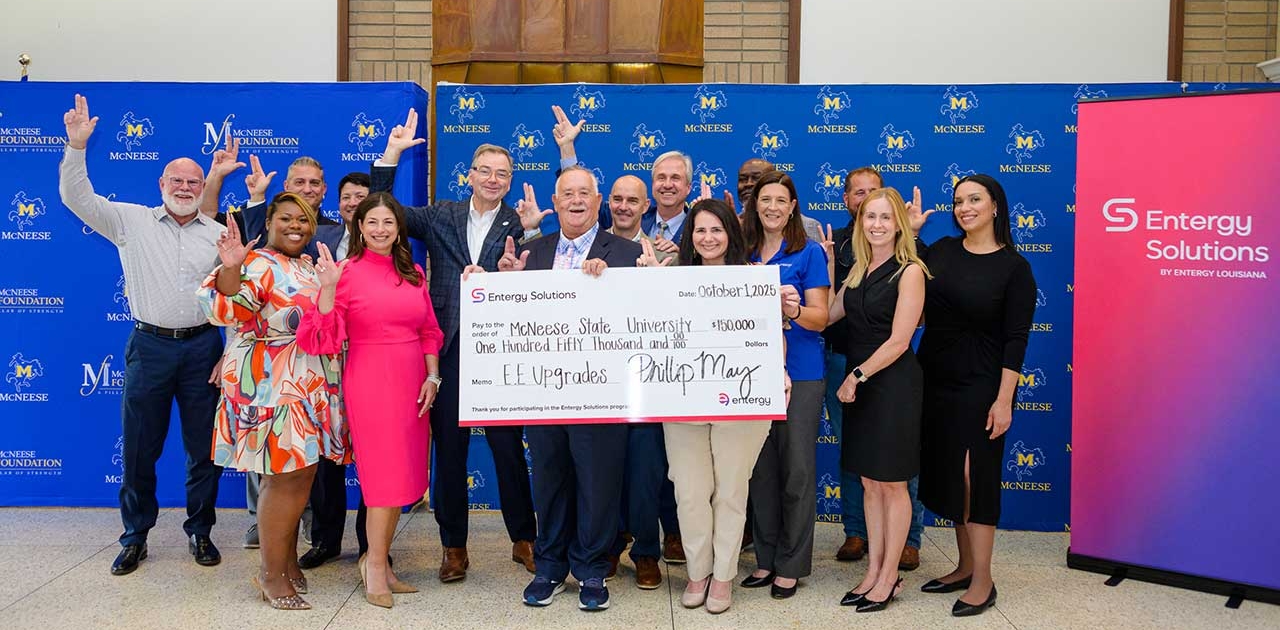Entergy Louisiana President and CEO Phillip May and members of the company’s leadership team presented McNeese State University with $150,000 to support major energy efficiency upgrades on campus through the Entergy Solutions program—an initiative that helps customers save energy and money by reducing the upfront cost of energy efficiency improvements. The investment reflects Entergy Louisiana’s ongoing commitment to helping educational institutions across the state lower energy costs and reinvest savings into student success.