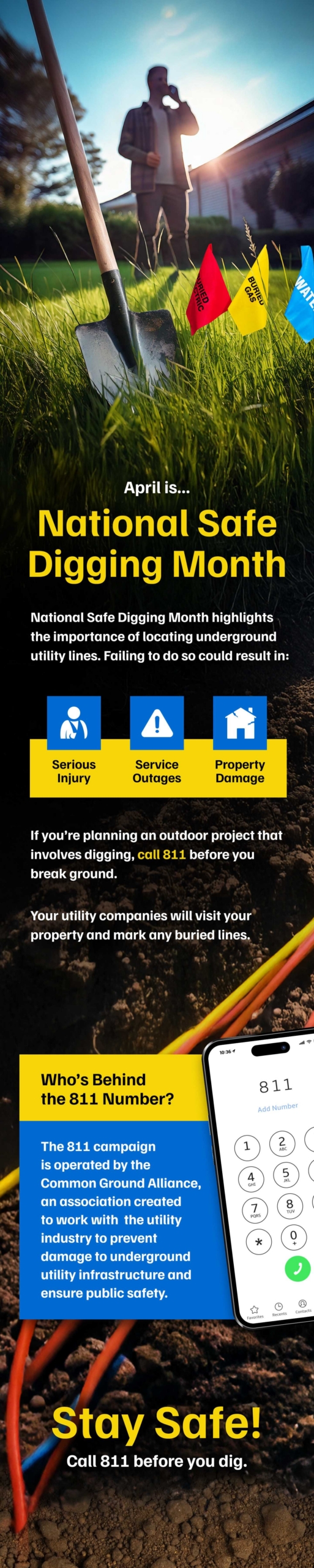 Hitting underground utility lines can cause service outages, property damage and serious injury. Remember to call 811 before you dig.
