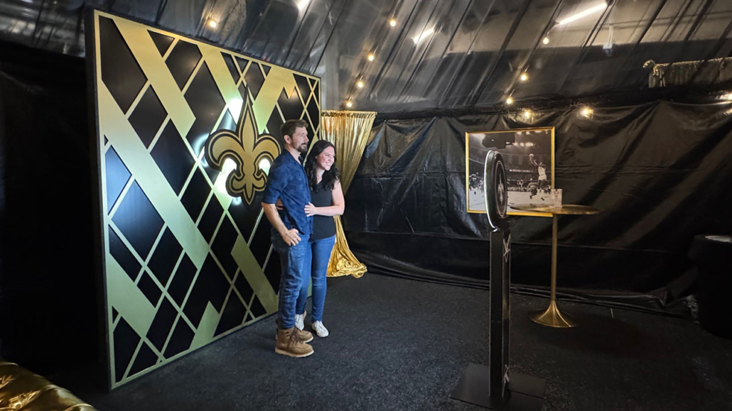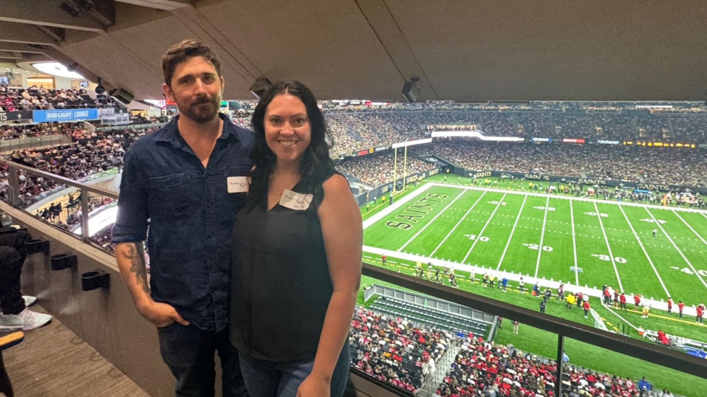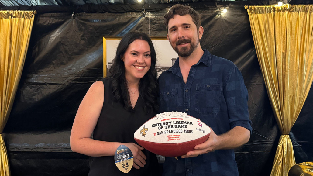 In recognition of his skill and dedication as an Entergy lineman, McLaughlin and his wife, Dr. Teresa Hulsey, were treated to a VIP experience on Sunday, which kicked off with a pre-game reception inside the Superdome. During the reception, Saints’ staff members presented McLaughlin with a commemorative football that noted his selection as Lineman of the Game.