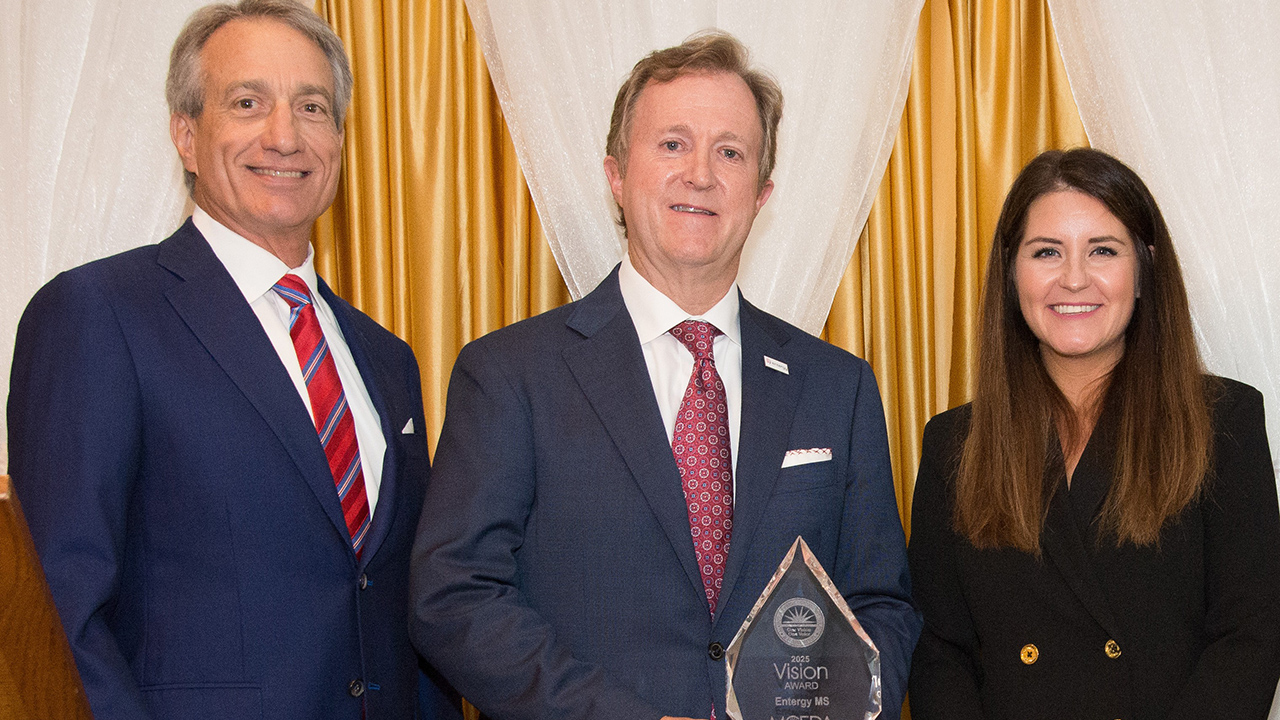 MCEDA Chair Gerard Gibert, SuperTalk Mississippi; Haley Fisackerly, Entergy Mississippi president and CEO; MCBL&F Chair Katie Bryant Snell, BSS Global.
