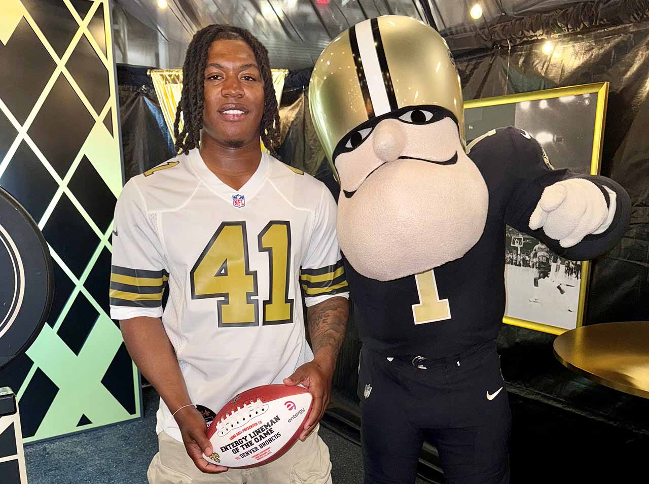 During the closing preseason matchup between the New Orleans Saints and the Denver Broncos, lineworker Zane Matthews was honored as “Lineman of the Game” for his hard work and dedication to his job. At each Saints home game, Entergy and the Saints recognize a lineworker for excellent job performance, commitment to safety, community involvement and more.