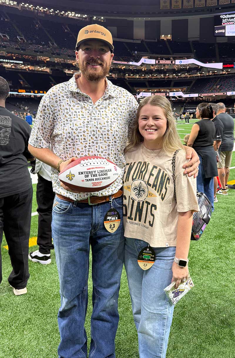 During the regular season matchup between the New Orleans Saints and the Tampa Bay Buccaneers, lineworker Cody DeLatte was honored as “Lineman of the Game” for his hard work and dedication to his job. At each Saints home game, Entergy and the Saints recognize a lineworker for excellent job performance, commitment to safety, community involvement and more.