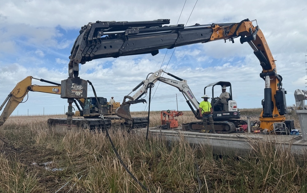 That’s the reality of a current resiliency project in coastal Louisiana. Entergy contractor Soggy Bottom Transmission and Distribution, a company that specializes in marine construction, is replacing 180 power poles across roughly 20 miles of marshland. Unlike traditional construction sites, these poles can’t simply be drilled into dry ground. Crews must drive them deep into the marsh to keep water out and ensure long-term stability. The work requires specialized equipment and a unique combination of expertise in transmission, distribution, and directional boring.