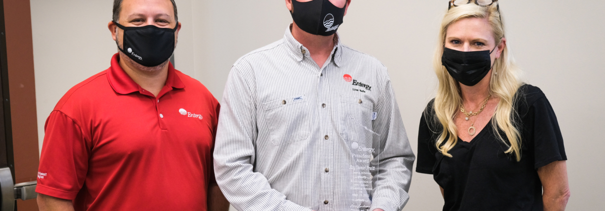Entergy line workers are trained in first aid and equipped with kits to respond to medical emergencies, including carrying an automated electric defibrillator (AED) for cardiac emergencies.