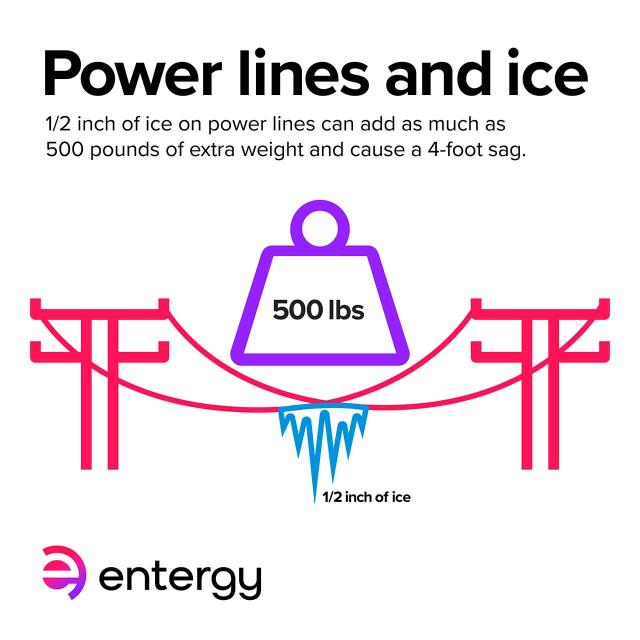 - A 1/2 inch of ice accumulation on power lines can add 500 pounds of extra weight resulting in extended outages.