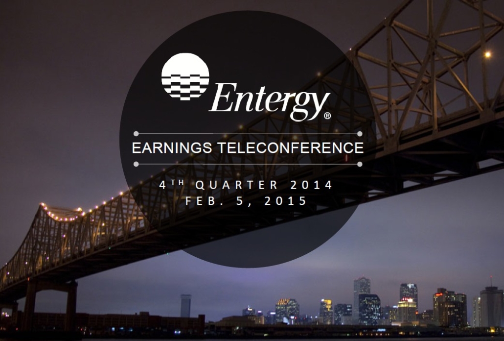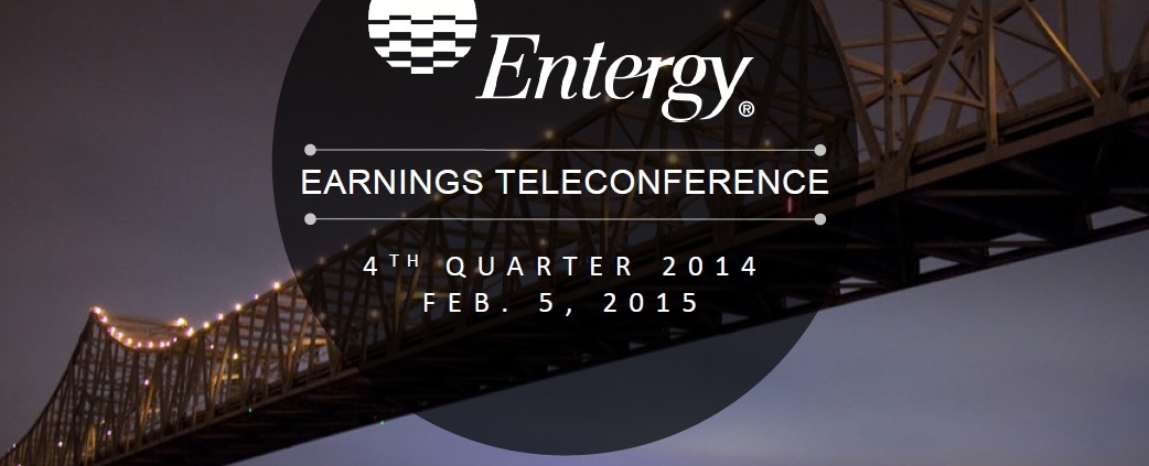 NEW ORLEANS – Entergy Corporation (NYSE: ETR) will report fourth quarter and full year earnings results before market open on Thursday, Feb. 5, 2015, and host a teleconference at 9 a.m. CST that day to discuss the earnings announcement and the company’s financial performance. The teleconference may be accessed by dialing 855-893-9849, confirmation code 62430843, no more than 15 minutes prior to the start of the call or by visiting Entergy’s website at www.entergy.com. From time to time, Entergy posts new and/or revised materials on its website and on social media, and anticipates doing so in connection with this event. The presentation slides will be available on Entergy’s website before market open on the day of the call. A replay of the teleconference will be available until Feb. 12, 2015, by dialing 855-859-2056, confirmation code 62430843.