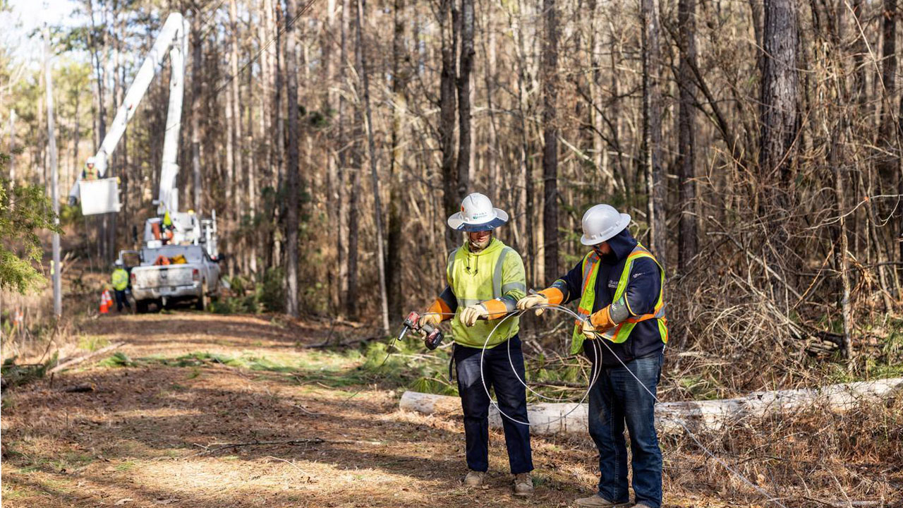 Crews replace power lines near Gore Springs, Mississippi.