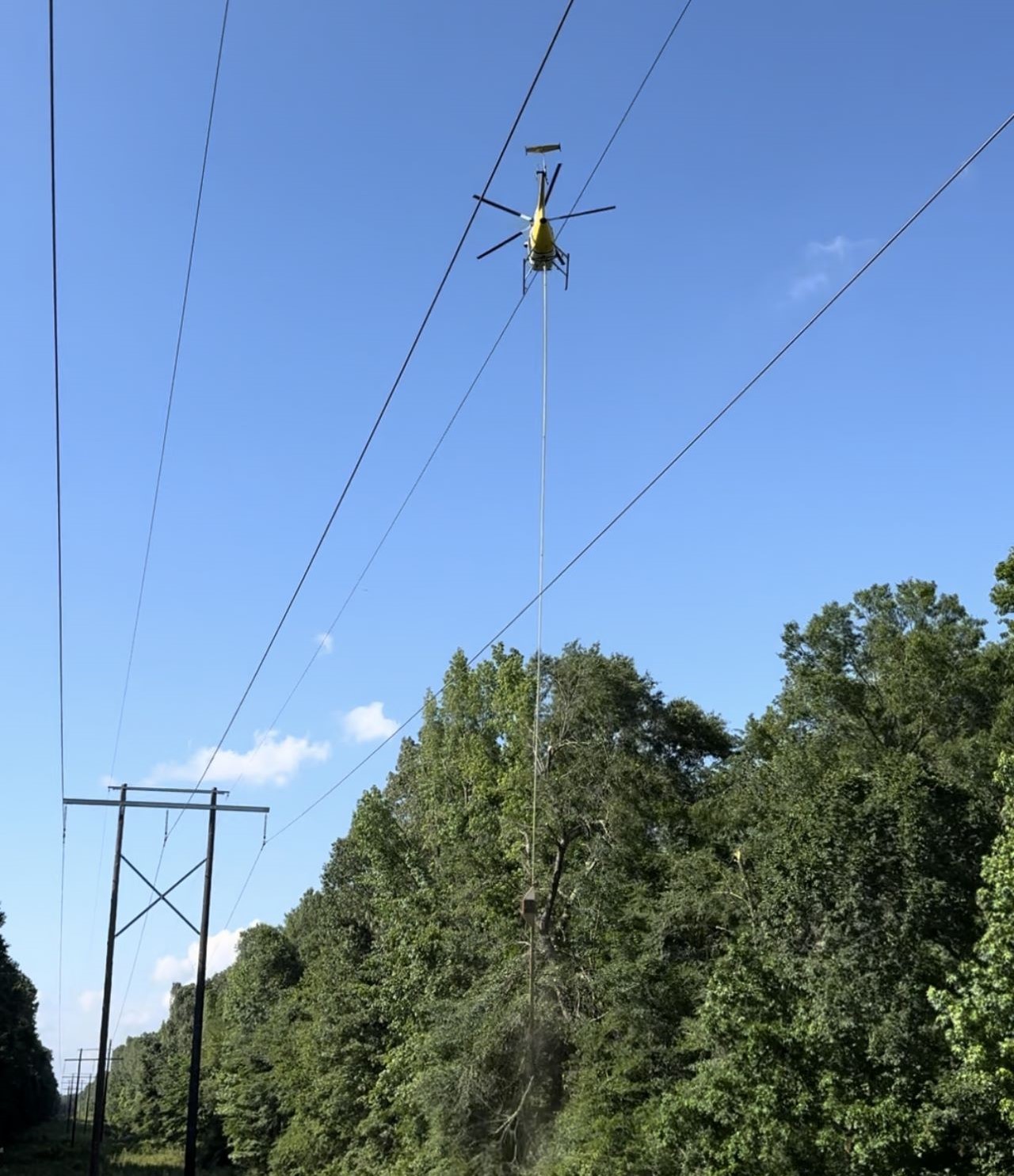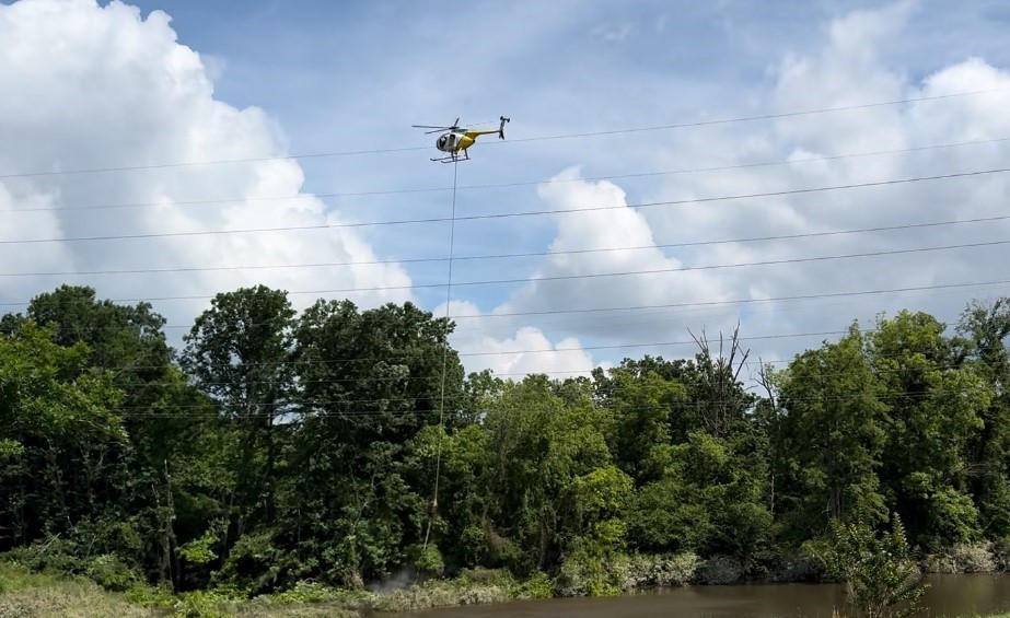 Another tool that we utilize to manage vegetation across our service territory is an airsaw. This is a helicopter carrying rotating saw blades that can trim remote or hard-to-access areas. The airsaw does not have the height limitations of our ground-based equipment, so we are able to remove all overhanging limbs that might cause outages. An additional benefit is reduced ground impact to your property compared to heavy equipment traditionally used to do the work.